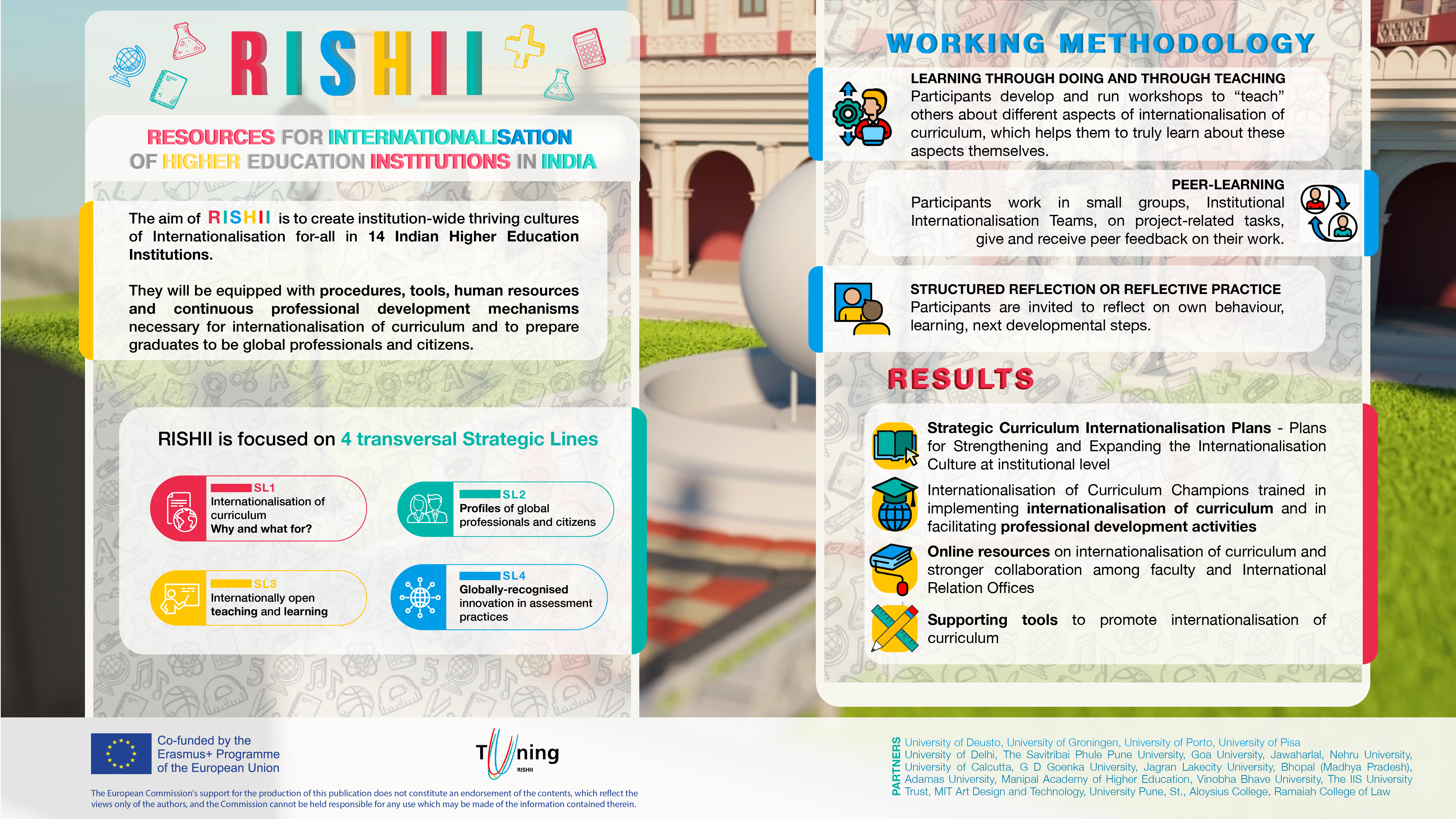 RISHII (Resources for Internationalization of Higher Education Institutions in India) aims at contributing to modernization of Indian Higher Education through equipping Indian Higher Education Institutions with procedures, tools, human resources and continuous professional development mechanisms necessary for Curriculum Internationalization and creating institution-wide thriving cultures of Internationalization-for-all. The objectives of the project include:
